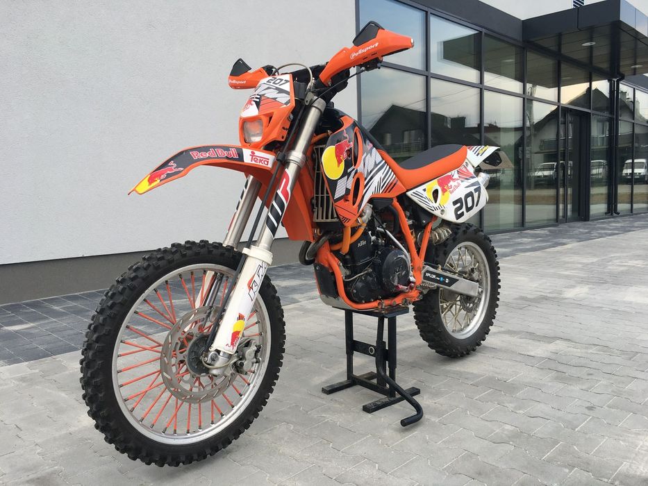 Sprzedam Ktm lc4 400 zarejestrowany, oc i przegląd aktualne. W tamtym sezonie przeszedł rozpołowienie silnika(graty do wglądu). Sporo podlubane, zestaw naprawczy wachacza i kiwaczki, zestawy naprawcze zacisków hamulcowych, zestaw regeneracyjny pompy hamulcowej tył,łożyska główki ramy, nowy zaworek w gaźniku, cięgno sprzęgła, cięgno prędkościomierza, nowe ślizgi łańcucha, szczotki rozrusznika i wiele innych pierdółek. Na chwile obecna maszyna pali z kopa i przycisku bardzo ładnie, gaźnik deltoro na oryginalnych dyszach i ustawieniach. Ładnie się wkręca. Na czasie olej do wymiany. Wizualnie trochę odrapany, okleina mogłaby zostać wymieniona. Dorzucam trochę nowych gratów widocznych na zdjęciach, ewentualnie Kask dla konkretnego kupującego. Cena do małej nego. Możliwy transport za dopłatą.