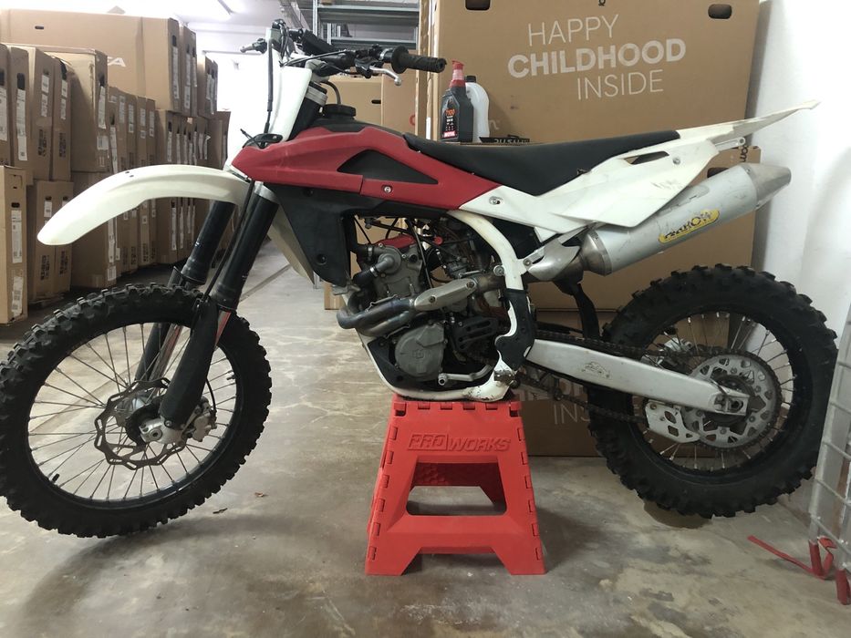 Motorul a fost cumparat de nou de mine de la Paneuro Trading (sos. Titulescu, Bucuresti), cand erau importatorii Piaggio si Husqvarna. L-am folosit foarte rar si strict hobby, fara curse sau hard-enduro, pt iesiri cu fii-mea. Cu toate astea, am avut cateva urcari unde am reusit sa i rup plasticul de la codita si protectia de radiator stg (v. poza). Motorul este 2011 si cred ca insumat are 6 sezoane de mers. De ex, ultima oara am iesit cu el de 2x acum 4 ani. Motor 249.5cc, 4 timpi, ~35cp, cu pornire la buton si pedala (baterie nu i-am mai cumparat). Ultimul model cu carburator. Suspensie Marzocchi + Sachs (spate). Neinmatriculabil. A fost transportat doar pe remorca si folosit doar in padure. Il dau pt ca imi ocupa loc degeaba. Deoarece nu a mai fost pornit, sigur va avea nevoie de o revizie completa. Pret in euro, usor negociabil.