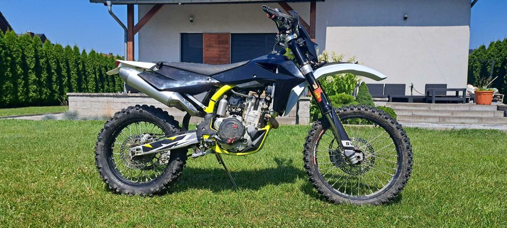 Na sprzedaż SWM RS 300R, rocznik 2020, kupiony nowy w 2021 w Dobek Racing. Pierwszy właściciel, zarejestrowany, OC do 03.05.2026. Przebieg: ~5500 km, ~230 mth. Motocykl jeżdżony rekreacyjnie, głównie na śląskich hałdach, regularnie serwisowany, z dużą liczbą świeżych części i pełną historią serwisową. Gotowy do jazdy. Olej i filtr oleju wymieniany 5mth temu. Użytkowanie: • Zakup nowy – kwiecień 2021, Dobek Racing • 2021 – nauka jazdy off-road • 2022 – przerwa (kontuzja kolana) • 2023–2025 – jazda terenowa, głównie hałdy Serwis techniczny: • Przełom 2021/2022 – przegląd według książki serwisowej: wymiana świecy zapłonowej, sprawdzenie luzów zaworowych, sprawdzenie płytek sprzęgła, smarowanie łożyska główki ramy, kontrola napięcia łańcucha i szprych, wymiana płynów • 140 mth (maj 2024) – remont góry silnika CogitoMotocykle + MotoKrzos (nowy tłok selekcja B, honowanie, uszczelki, udostępnię paragon za usługę) • 160 mth (lipiec 2024) – serwis zawieszenia (Wysocki Suspension), nowe sprężyny (85 kg), smarowanie kiwaczki i łożysk, nowe tulejki kół • Listopad 2024 – kompletny nowy napęd: zębatki (przód i tył), łańcuch, uszczelka zdawczej • Styczeń 2025 – modyfikacja sprzęgła (2 sprężyny wyjęte – lżejsza praca) • 190 mth (kwiecień 2025) – wymiana sprzęgła rozrusznika + nowa świeca • Sierpień 2025 – wymiana płynów hamulcowych, nowe plastiki Koła i hamulce: • Opony Shinko Enduro 216 MX – założone 01.2025 • Dętki Michelin (tył UHD) – 07.2024 • Klocki hamulcowe – wymienione w 2025, bardzo dobry stan Wyposażenie i dodatki: • AS3 Performance: tylna zębatka 52T (+2), klamki, pegi, pedał, dźwignia zmiany biegów • Przelotowy stelaż filtra powietrza (zamiast fabrycznego „ślimaka”) • Osłony pokryw silnika Enduro Hog • Handbary Acerbis (pełne) – 2025 • Paski Proworks – przód i tył • Nowy licznik – po uszkodzeniu szybki w oryginale • Nowe zapasowe plastiki – ogon, uchwyt tablicy i kierunkowskazów, przednie panele boczne lewy i prawy • Karton ściągniętych części: kierunkowskazy, pegi, klamki, oryginalne sprężyny Zachowanie w użytkowaniu: • Odpala najlepiej na ssaniu – ciepły i zimny • Wgrana mapa zapłonu lekko odblokowana (oryginalny wydech – niepełna race map) Uczciwie o stanie: • Obejma pompy sprzęgła – sklejona na zimny spaw, działa • Czujnik luzu przy klamce – zataśmowany, działa (zapasowy dorzucam do zamontowania) • Obejmy kierownicy – nieoryginalne • Sporadyczny brak długich świateł – kostka za lampą • Stacyjka się poluzowała i przy większych wstrząsach potrafi wypaść (kluczyk jest spięty trykom z przewodem hamulcowym, aby jej przez przypadek nie zgubić) • Płytki sprzęgła od nowości – sprzęgło działa dobrze, ale warto zajrzeć przy okazji • Można by też wymienić płyn w chłodnicy Dokumenty • Faktura zakupu • Zarejestrowany • Przegląd ważny do 03.05.2026 • OC do 03.05.2026 • Dowód rejestracyjny, karta pojazdu, książka serwisowa Lokalizacja Nieborowice Cena: 11 900 zł Kontakt: 60*******41