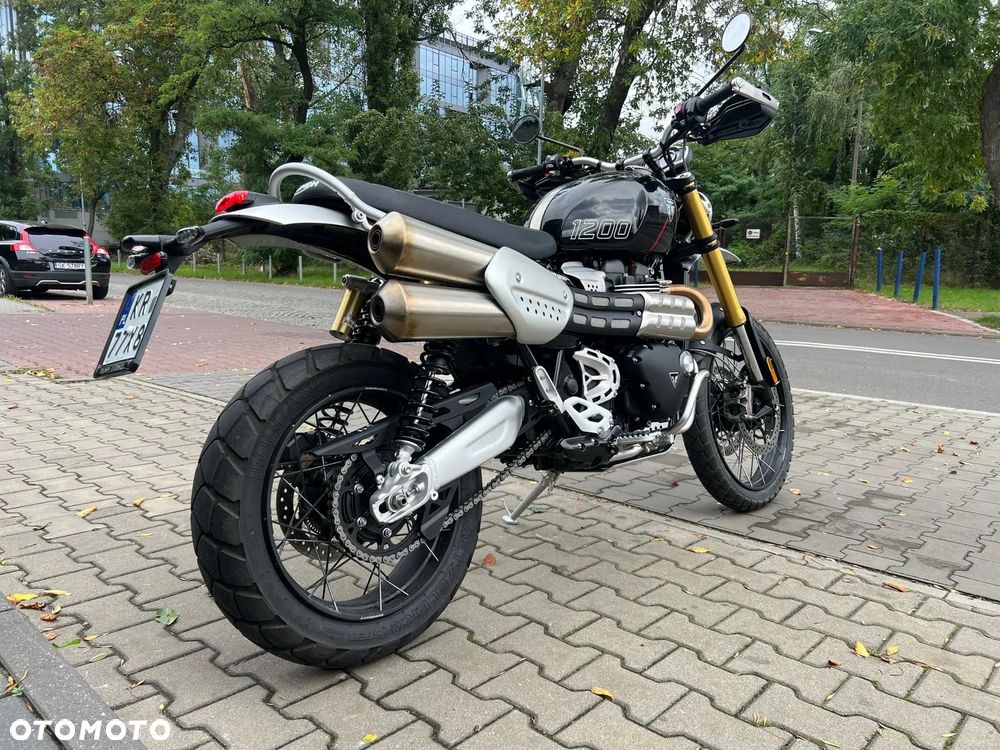 Scrambler 1200 XE PHANTOM BLACK / STORM GREY Motocykl demonstracyjny z przebiegiem 1991km, wykonanym pierwszym serwisem na "1000km". Motocykl w ciągłej eksploatacji.* Cena motocykla nie obejmuje wyposażenia akcesoryjnego.* Cena podana w ogłoszeniu dotyczy motocykla w podstawowym malowaniu. Prosimy o kontakt telefoniczny celem potwierdzenia terminu dostawy. Linia motocykli Scrambler 1200 to najdoskonalsze połączenie dwurzędowego silnika Bonneville o pojemności 1200 cm3, wiodących w swojej klasie najnowocześniejszych technologii ukierunkowanych na kierowcę, przepięknego stylu nowoczesnego customa oraz DNA niezrównanej oryginalnej konstrukcji. To punkt odniesienia dla definiujących tę kategorię możliwości. Ten motocykl gwarantuje wszystko to, co jest niezbędne do wyniesienia radości z jazdy na najbardziej ekscytujący poziom, zarówno na drogach utwardzonych, jak i w warunkach off-roadowych. DANE TECHNICZNE Silnik: chłodzony cieczą, 8-zaworowy, SOHC, 270°, rzędowy Pojemność: 1200cm³ Moc: 90KM / 66,2kW przy 7000 obr./min Moment obrotowy: 110Nm przy 4250 obr./min Sprzęgło: wielotarczowe, mokre Skrzynia biegów: 6-biegowa Zawieszenie: Marzocchi™ 45mm, w pełni regulowane, skok 250 mm Masa bez płynów: 207kg Wysokość siedzenia: 870mm Pojemność zbiornika paliwa: 16l WYPOSAŻENIE SERYJNE: - Hamulce Brembo M4.30 - Regulowane zawieszenie Marzocchi™ - Szprychowane koła, - Ochraniacze dłoni z aluminiowym wspornikiem, - Wyświetlacz TFT, - Ergonomiczne, podświetlane przełączniki z joystickiem, - System Ride-by-Wire, - ABS i kontrola trakcji z IMU, - System bezkluczykowy, - Oświetlenie LED, - Tempomat, - Złącze USB, - 6 trybów jazdy, - Aluminiowe błotniki i inne akcenty nadwozia, - Możliwość dodania modułu Bluetooth MyTriumph do integracji z GoPro, nawigacją i telefonem. Jesteśmy Autoryzowanym Salonem marki Triumph. W stałej ekspozycji na salonie posiadamy kilkanaście sztuk motocykli brytyjskiego producenta. W naszej ofercie posiadamy wszystkie aktualnie produkowane motocykle Triumpha! Oferujemy różnorodne formy finansowania zakupu motocykla, spersonalizowane i dostosowane do indywidualnych wymagań naszych klientów. Jeżeli jesteś zainteresowany innym kolorem lub modelem zapraszamy do kontaktu telefonicznego lub mailowego. W razie pytań zapraszamy do kontaktu lub odwiedzenia naszego salonu. Zapraszamy! 24 września 2025 15:38 ID: 6142121203